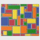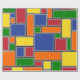 Este papel de envoltura tiene un diseño Bauhaus de rectángulos formados con líneas grises y llenos de rojo, amarillo, naranja, azul y verde sobre un campo de negro.
