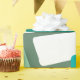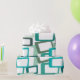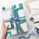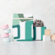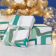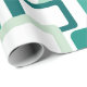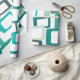 Este papel de envoltura tiene un diseño moderno de mediados de siglo de rectángulos sesgados con agujeros blancos en tonos azul-verde.