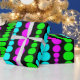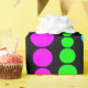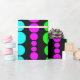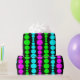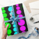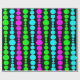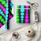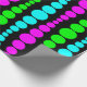 Este papel envolvente tiene un diseño moderno de mediados de siglo de rectángulos redondeados de neón rosa, verde y azul en un tamaño creciente y decreciente que corre verticalmente sobre un campo de negro.