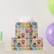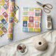 Este papel de envoltura tiene un diseño moderno de mediados de siglo de rectángulos hechos de rayas con un estallido blanco sobre ellas.