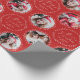 Christmas gift wrapping paper feature modern Merry Christmas script and botanical leaves wreaths, with personalized family name and 6 photos in red and white. simple and elegant.