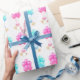 Envoltura de regalo para gemelos bebé niño y niña o decoración para fiesta de bebé con gemelos recién nacidos debajo de globos rosas y azules.
