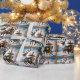 Este divertido diseño tiene un reno de vapor tirando de un carrito metalizado de ruedas.