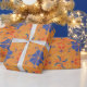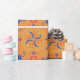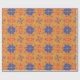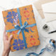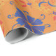 Orange wrapping paper featuring a repeating pattern of blue flowers, red hearts, and colorful swirls displayed both unrolled and flat.