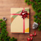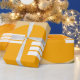Este papel envolvente tiene un diseño abstracto moderno de mediados de siglo de un círculo dorado dentro de un círculo verde con rayas naranjas y blancas.