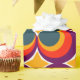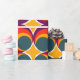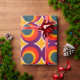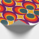 Este papel de envoltura tiene un diseño moderno de mediados de siglo de círculos concéntricos en colores de los años 70 con estrellas entre cada grupo.
