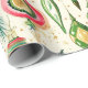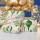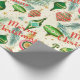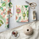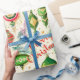 Este papel envuelto vibrante muestra un diseño de Navidades de inspiración retro sobre un fondo liviano y moteado que sugiere una textura de papel vintage. El patrón es rico con una variedad de adornos navideños tradicionales en tonos verdes, dorados y rosados/rojos. Estos adornos presentan detalles complejos como rayas, remolinos y patrones texturados, dándoles un aspecto clásico y ornamental. Parecen estar colgados, con líneas sutiles que se extienden hacia arriba como si fueran de una rama. Entre los adornos se entremezclan delicadas agujas de pino verde o estribos, junto con pequeños estribos dorados y puntos que añaden un brillo festivo. La frase "Feliz Navidad", escrita en un guión rojo encantador y un poco angustiado, se destaca principalmente a lo largo del diseño, añadiendo un toque cálido y personal. La estética general es nostálgica, con un claro énfasis en la decoración navideña clásica.