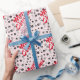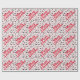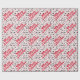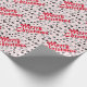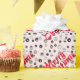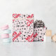 Papel de regalo único, moderno, retro de color rosa pastel y rojo con adornos de árbol de Navidad negros y blancos, patrón dibujado a mano.