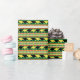 Rinocerontes negros y amarillos marchan por rayas verdes alternando con rayas ligeramente "tejidas" en colores africanos de rojo, negro y verde con acentos amarillos.