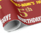 Este diseño de papel envolvente incluye un mensaje como "¡QUINTO CUMPLEAÑOS DE NOMBRE PRIMERO!", en el que el "quinto" tiene un aspecto de color falso/imitación dorado, y con el nombre y el "CUMPLEAÑOS" en un tipo de letra divertido y audaz. El nombre se puede personalizar y el fondo es de color rojo. El papel envuelto como este podría ser usado cuando se le dan regalos de cumpleaños a alguien en celebración de su quinto cumpleaños. [~Z0000204]