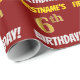 Este diseño de papel envolvente incluye un mensaje como "¡SÉPTIMO CUMPLEAÑOS DE FIRSTNAME!", en el que el "sexto" tiene un aspecto de color falso/imitación de color dorado, y con el nombre y el "CUMPLEAÑOS" en un tipo de letra divertido y audaz. El nombre es personalizable y el fondo es rojo. El envolvimiento de papel como este podría ser usado cuando se le dan regalos de cumpleaños a alguien en celebración de su sexto cumpleaños. [~Z0000204]