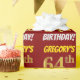 Este diseño de papel envolvente incluye un mensaje como "¡EL CUMPLEAÑOS 64 DE GREGORY!", en el que el "64" tiene un aspecto de color falso/imitación de oro, y con el nombre y el "CUMPLEAÑOS" en un tipo de letra divertido y audaz. El nombre se puede personalizar y el fondo es de color rojo. El papel envuelto como este podría ser usado cuando se le dan regalos de cumpleaños a alguien en celebración de su sexagésimo cuarto cumpleaños. [~Z0000204]