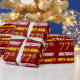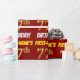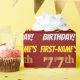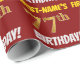 Este diseño de papel envolvente incluye un mensaje como "¡CUMPLEAÑOS 77 DE PRIMER NOMBRE!", mientras que el "77" tiene un aspecto de color falso/imitación de color dorado, y con el nombre y el "CUMPLEAÑOS" en un tipo de letra divertido y audaz. El nombre se puede personalizar y el fondo es de color rojo. El papel envuelto como este podría ser usado cuando se le dan regalos de cumpleaños a alguien en celebración de sus setenta y siete años. [~Z0000204]