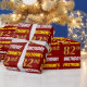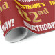 Este diseño de papel envolvente incluye un mensaje como "¡EL CUMPLEAÑOS 82 DE FIRSTNAME!", en el que el "82" tiene un aspecto de color falso/imitación de color dorado, y con el nombre y el "CUMPLEAÑOS" en un tipo de letra divertido y audaz. El nombre se puede personalizar y el fondo es de color rojo. El envolvimiento de papel como este podría ser usado cuando se le dan regalos de cumpleaños a alguien en celebración de su 82° cumpleaños. [~Z0000204]