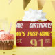 Este diseño de papel envolvente incluye un mensaje como "¡CUMPLEAÑOS 91 DE PRIMER NOMBRE!", mientras que el "91" tiene un aspecto de color falso/imitación de color dorado, y con el nombre y el "CUMPLEAÑOS" en un tipo de letra divertido y audaz. El nombre se puede personalizar y el fondo es de color rojo. El envolvimiento de papel como este podría ser usado cuando se le dan regalos de cumpleaños a alguien en celebración de su cumpleaños noventa. [~Z0000204]