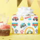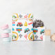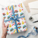 Varios adorables camiones monstruosos con colores de rojo, azul y verde son la característica del patrón en este lindo papel de envoltura para un niño. Junto con las imágenes de los camiones hay estrellas, llamas de fuego, banderas a cuadros y texto que dice "Monster" y "Roll On". Añade su propio nombre en azul para personalizarlo sólo para él. Si desea eliminar el nombre, simplemente desactive el campo.