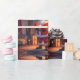 Una cálida y acogedora escena de Navidades con Santa Claus junto a una chimenea. Santa, vestido con su clásico traje rojo con guarnecido de piel blanca, sostiene un regalo bellamente envuelto con una cinta dorada. La sala está decorada para las vacaciones, con un árbol de Navidad luminoso adornado con adornos, guirnaldas y una estrella brillante en lo alto. Se organizan cuidadosamente regalos coloridos alrededor del árbol y del hogar. El mantel situado encima de la chimenea está decorado con velas y una corona de flores con un arco rojo. A través de la ventana se puede ver una velada nevada que completa el ambiente Navidad.