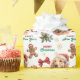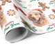 The repeated pattern on this Christmas wrapping paper includes an image of a Golden Retriever dog wearing a red and white Santa Claus hat. Also included in the pattern is a gingerbread man, a red bow, a holly sprig with red berries, and varied sizes of ornate gold snowflakes. Stylized red and green text says MERRY CHRISTMAS" and "HAPPY NEW YEAR". Be sure to see the many other products with dog images (and cats, too!) at Dog Village.