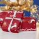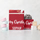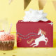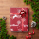 Modern, cute, elegant personalized Christmas gift wrap for kids, with a unicorn (with a red-and-golden mane and tale) pulling Santa's sleigh; the greeting "Merry Christmas" in stylish typography; and a personalized name. On a Xmas red background, with many cute, festive snowflakes.