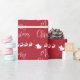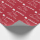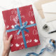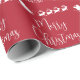 Papel de envoltura rojo festivo con una silueta de renos que vuelan en trineo de Santa por el aire y "Feliz Navidad" con un elegante guión blanco.