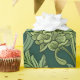 Seamless William Morris style wallpaper pattern featuring dense green foliage and large, rounded flowers in shades of lime green, off-white, and muted lavender against a dark emerald background.
