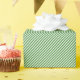 Las rayas de golosinas son un clásico versátil, ideal para todo, desde cumpleaños y vacaciones de Navidades hasta regalos cotidianos. Este ajuste de regalo presenta un patrón de rayas diagonales simples y delgadas, con la opción de cambiar el color de fondo verde utilizando la herramienta de edición de diseño. Para un ambiente tradicional, intenta atarlo con una cuerda de yute o añadir un lujoso arco para un aspecto más sofisticado. Disponible en papel de calidad superior con acabado mate o brillante. Colores impresos: verde y blanco.