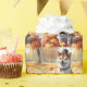 Una pintura acuarela de un perro alegre sentado en medio de un montón de hojas caídas vibrantes, rodeado de pequeñas calabazas y bellotas dispersas. El perro lleva un pequeño gorra peregrino y vigas de alegría, capturando el espíritu del Día de Acción de Gracias. Como telón de fondo, los campos de suave cosecha y los árboles de tonos dorados crean un ambiente campestre tranquilo. Las texturas suaves y los tonos cálidos y mudos del otoño le dan al lugar un ambiente acogedor y nostálgico, perfecto para celebrar la belleza de la temporada.