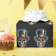 Calavera elegante con un elegante sombrero superior sobre un fondo negro.
