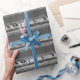 Una imagen en blanco y negro de jirafas al lado del agua adorna este papel de envoltura.