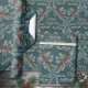 Un elegante, sofisticado y festivo envolvimiento de vacaciones con ramas de abeto azul plateado y bayas rojas en formación de celosías sobre un fondo verde de pizarra profunda con las palabras "Feliz Navidad" escrito en una brusca mano de plata escrita en las ventanas de celosías.