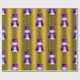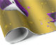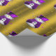 Un lindo y colorido papel envuelto de Navidades dorados con un patrón de pequeños hombres de nieve vestidos con sombreros y chalecos de terciopelo morado, rodeados de estrellas doradas para darle un toque de diseño y capricho a tu envoltura de regalo en esta temporada de vacaciones.