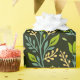 Seamless floral pattern with green leaves and buds on a dark background, featuring intricate blue and beige branches, evoking a natural, elegant feel.