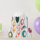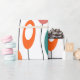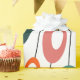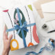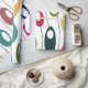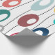 Este papel envolvente tiene un diseño moderno de mediados de siglo de líneas horizontales de color sobre una línea negra vertical con círculos.