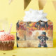 Una pintura acuarela de un perro alegre sentado en medio de un montón de hojas caídas vibrantes, rodeado de pequeñas calabazas y bellotas dispersas. El perro lleva un pequeño gorra peregrino y vigas de alegría, capturando el espíritu del Día de Acción de Gracias. Como telón de fondo, los campos de suave cosecha y los árboles de tonos dorados crean un ambiente campestre tranquilo. Las texturas suaves y los tonos cálidos y mudos del otoño le dan al lugar un ambiente acogedor y nostálgico, perfecto para celebrar la belleza de la temporada.
