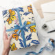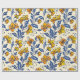 Seamless pattern of orange and yellow flowers with blue leaves on a beige background. The floral motif creates a lively, cheerful tone.
