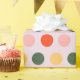 The paper features a mid century modern polka dots pattern. The design uses a coordinated mix of muted coral, sunny mustard yellow, and sage green set against a soft lavender or pale pink background. Perfect for birthdays, holidays, or everyday gifting, this design adds a joyful pop of color to any present—no extra embellishments needed.