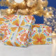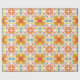 Colorful wrapping paper featuring a symmetrical pattern of orange and yellow flowers with blue accents. Shown unrolled and flat, conveying vibrancy and joy.