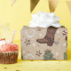Córcago de vaquero de temática occidental, lindo y divertido, periódico navideño navideño. Hacen pasteles para las vacaciones festivas. El diseño incluye botas y gorras de vaquero, cactus, árboles de Navidad y dulces. Color verde, marrón, rojo y blanco. De arena fina y color beige.