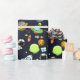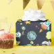 Papel de envolvimiento con estampado con un patrón adorable y colorido con todo tipo de elementos temáticos en el espacio ultraterrestre. Las imágenes incluyen astronautas flotando en sus trajes blancos. Estrellas y planetas y pequeños buques de cohetes, naves espaciales y satélites frescos. Diseño divertido y loco.