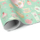 Grandes teteras de color de agua pastel, telecabinas y rosas sobre papel de envolvimiento verde de menta para todos los amantes del té.
