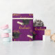 Felicitaciones Graduado de papel envolvente en un fondo morado de bonito con un ilustracion de tapa de graduación y rollo de diploma.
