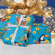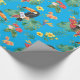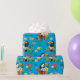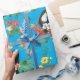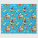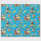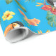 Patrón tropical con tocanes, hibiscos, heliconia y anurio sobre un azul brillante.