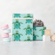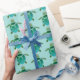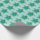 El diseño de la envoltura de regalo es lindo y presenta pequeños patrones de tortugas azul-verde sobre fondo acuático