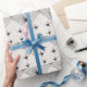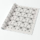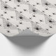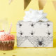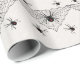 Este rollo de papel envolvente es blanco con filas de telarañas triangulares negras con arañas de viudas negras con marcas de vidrio rojo.