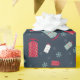 Los trineos y los copos de nieve modelados enrrollados del invierno caen a través de un fondo de los azules marinos. Un esquema de color moderno del rojo, de la marina de guerra, de la aguamarina y del blanco hace una declaración intrépida. Etiquetas y cinta de coordinación del regalo también disponibles.