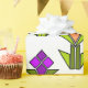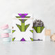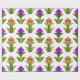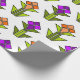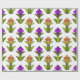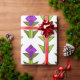 Este papel de envoltura tiene un diseño art deco hecho de diamantes, triángulos y polígonos haciendo tulipanes en naranja y morado con tallos y hojas verdes.