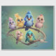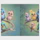 Un bonito desfile de pájaros personalizados en colores vibrantes. Los pájaros están decorados en tonos vivos y coloridos, como el azul, el amarillo, el rosa y el verde-azul. Sus grandes ojos expresivos irradian alegría y curiosidad, dándole a toda la escena un ambiente agradable y despreocupado. El fondo es de un verde suave y un gradiente suave que atrae la atención hacia las aves.