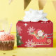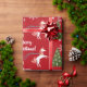 Elegant, modern, festive personalized Christmas wrapping paper with a unicorn pulling Santa's sleigh towards a fir tree decorated with silver baubles. The unicorn has a red and golden mane and tail and the sleigh carries Santa along with many gifts. The text boxes say "Merry Christmas!" and the name of the recipient (make sure you personalize it!). On a Christmas red background, with many cute snowflakes.