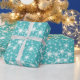 Papel envuelto con un patrón de copo de nieve de invierno sobre fondo azul. Perfecto para Navidades/celebraciones de feriado.