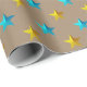 Papel de envoltura festivo para la temporada de Navidades con estrellas azul turquesa y oro sobre un fondo rústico de papel kraft. Ideal para cualquier ocasión y hace un regalo impresionante.
